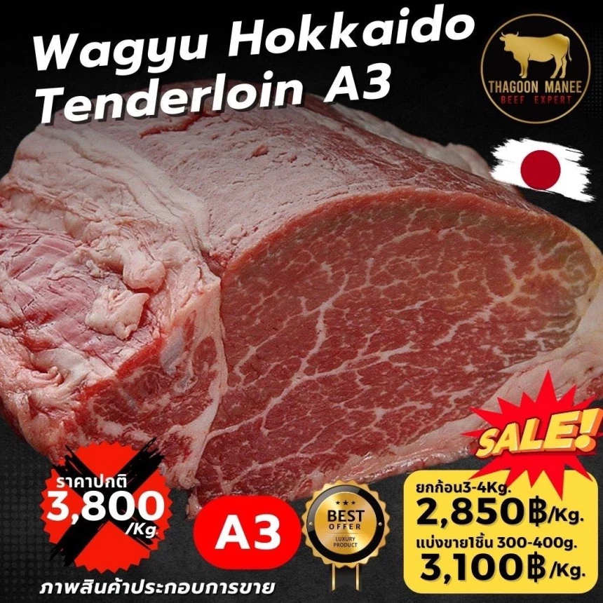 - Wagyu Hokkaido Tenderloin A3 ขายขั้นต่ำ 1 ชิ้น ชิ้นละ 1 กิโลกรัม